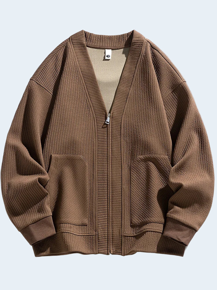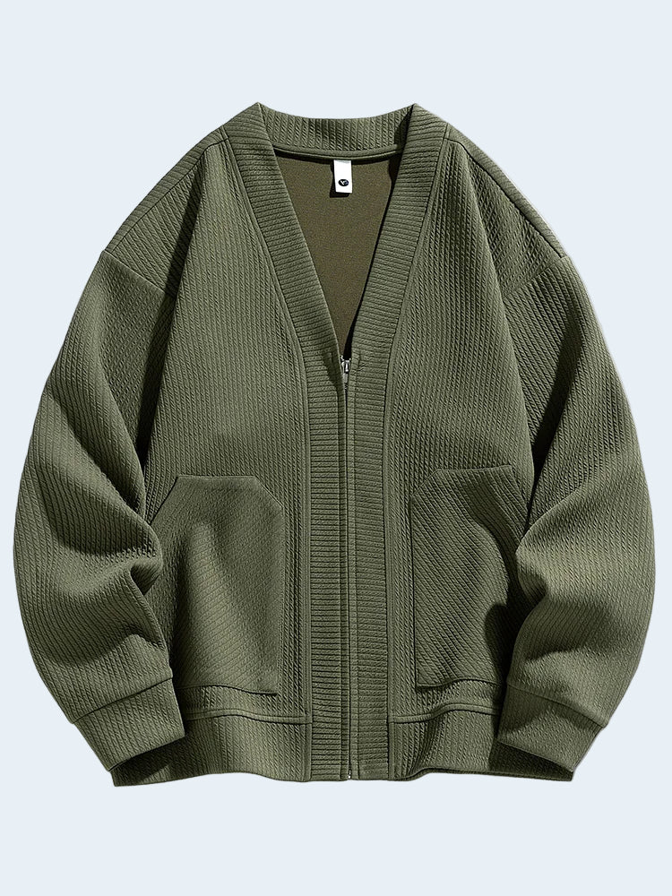 A soft, textured knit zip-up cardigan designed for everyday comfort and easy layering. Lightweight yet insulating, it provides warm, breathable wear throughout fall and winter. With its clean zip front and refined knit texture, it delivers versatility, warmth, and effortless styling for cooler days.