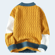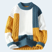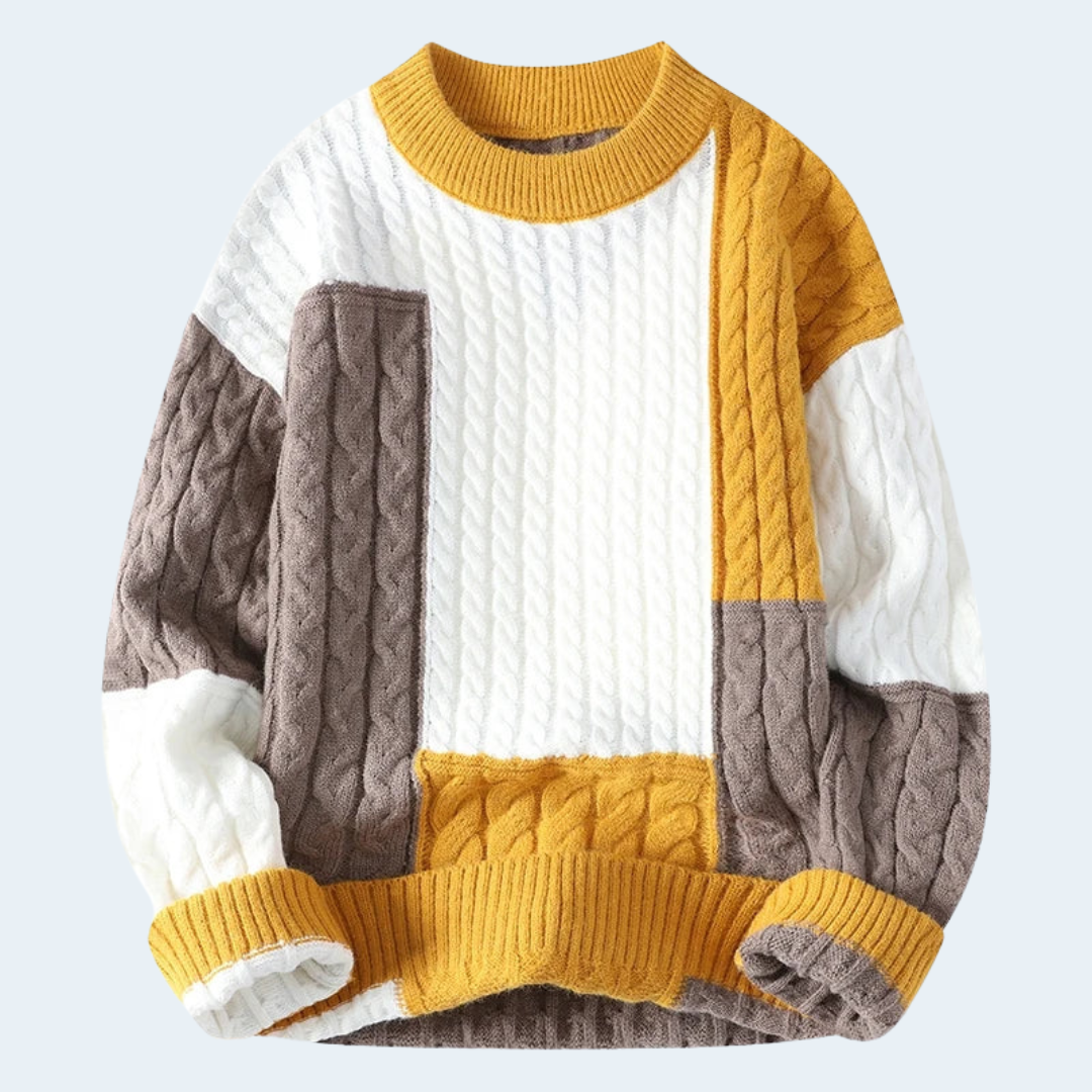 Crafted from a buttery soft knit, this patchwork sweater blends texture, warmth, and modern colour-block styling. The refined cable-knit detailing gives it depth and character, while the relaxed silhouette offers easy everyday comfort. Warm yet breathable, it’s a standout knitwear piece that works effortlessly across casual and smart-casual outfits.