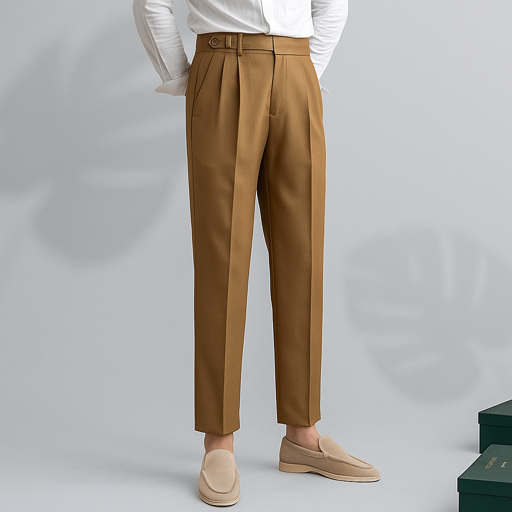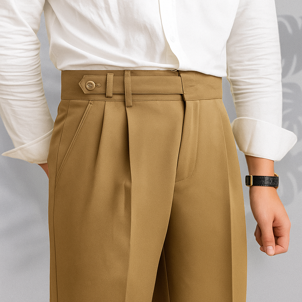 The Rey High-Waist Trousers deliver a clean, tailored silhouette with timeless appeal. Designed with a high-rise cut and adjustable side tabs, they offer a secure and refined fit without the need for a belt. Subtle front pleats enhance shape and drape, creating a look that feels both classic and contemporary. Ideal for polished everyday wear or more elevated occasions, these trousers bring quiet sophistication to any wardrobe.