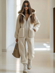 Biruvi | Women’s Casual Loose Vintage Polar Fleece Hooded Jumpsuit Sherpa Hoodie Style