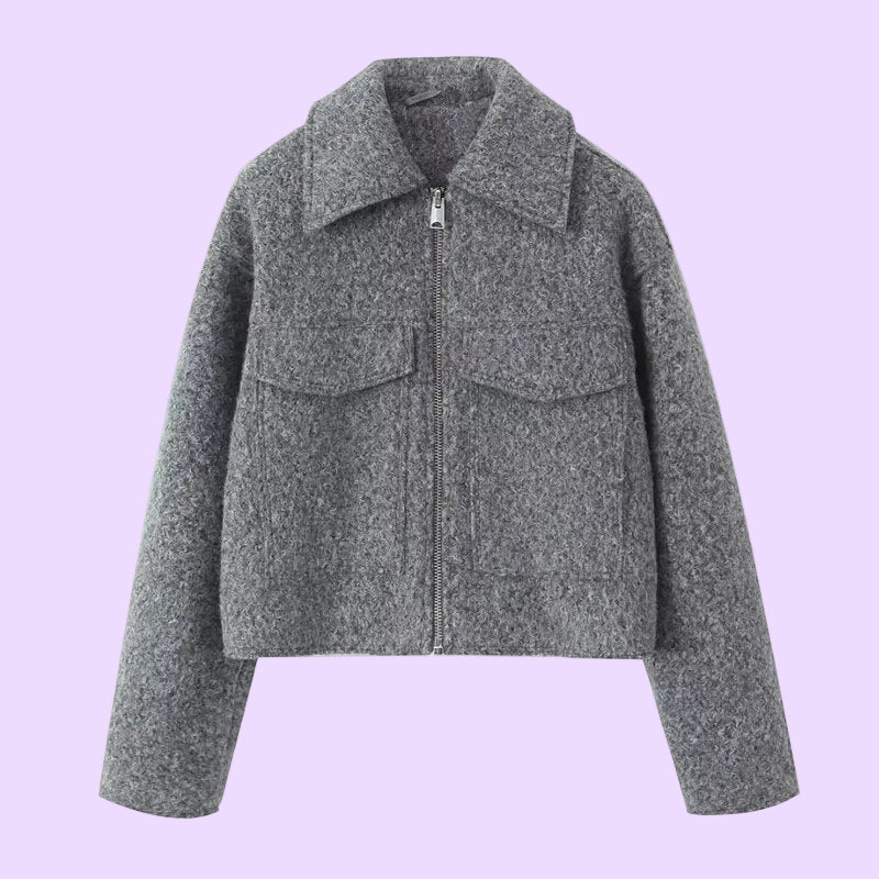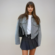 A soft boucle cropped jacket designed with a boxy silhouette, structured shoulders, oversized chest pockets, and a raw-edge hem for modern textural appeal. Lightweight yet polished, it’s ideal for transitional weather and effortlessly elevates everyday outfits with chic, contemporary style.
